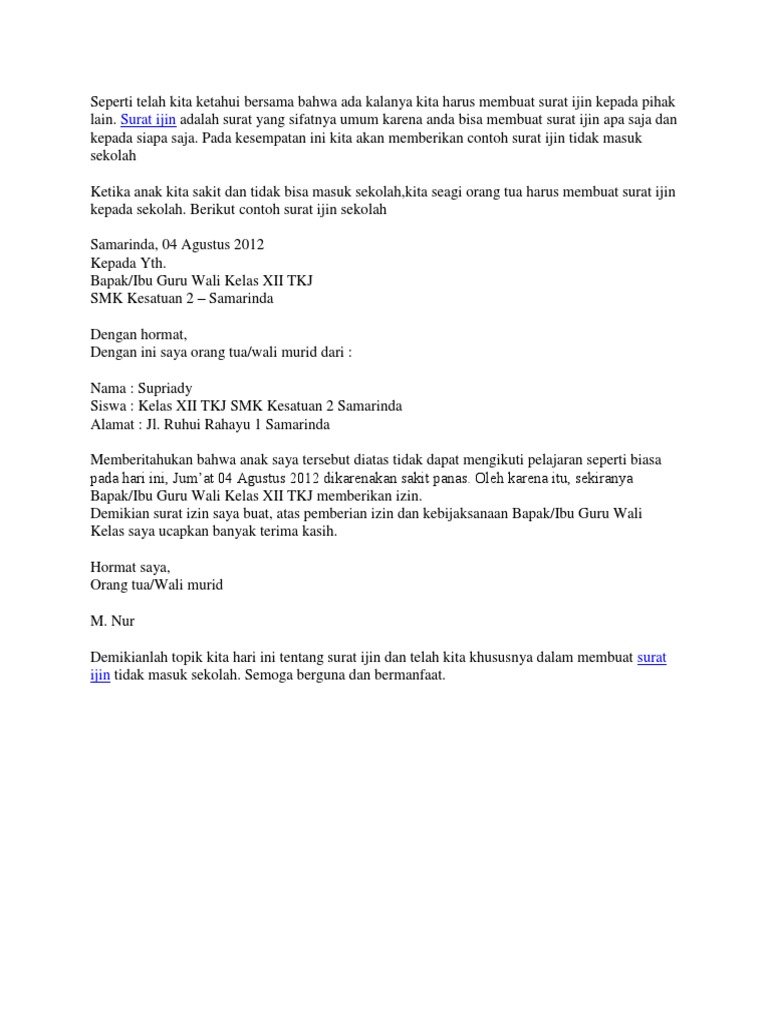 Informasi tentang contoh surat izin tidak masuk sekolah karena sakit atau halangan lain tidak masuk kerja tidak masuk kuliah surat izin dari orang tua surat izin untuk kegiatan peminjaman tempat dsb.