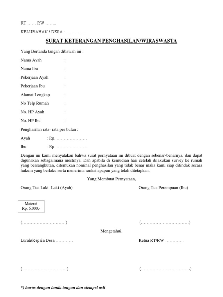 Great Contoh Surat Pernyataan Penghasilan Orang Tua Bermaterai 6000