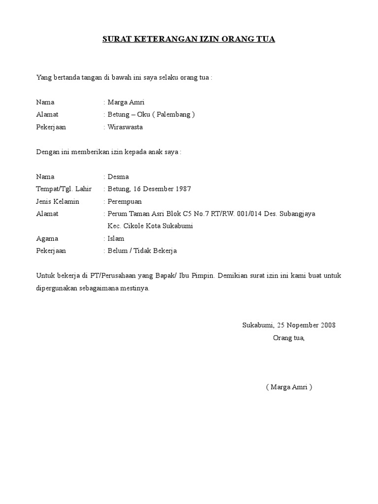 Contoh Surat Izin Orang Tua Untuk Melamar Kerja Di Pt Atau Pabrik