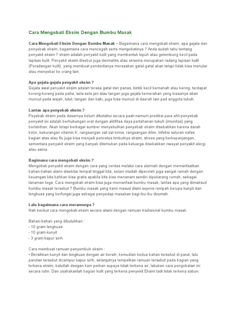 Apabila berbagai komplikasi tersebut terjadi ada baiknya anda segera mencari pengobatan yang tepat agar penyakit kulit eksim dermatitis dapat diatasi sejak dini cara mengobati eksim dermatitis secara alami efektif dan cepat. Simak gejala penyebab dan cara mengatasi penyakit eksim eksem secara alami. Cara mengobati eksim secara alami dengan ramuan tradisional 1.