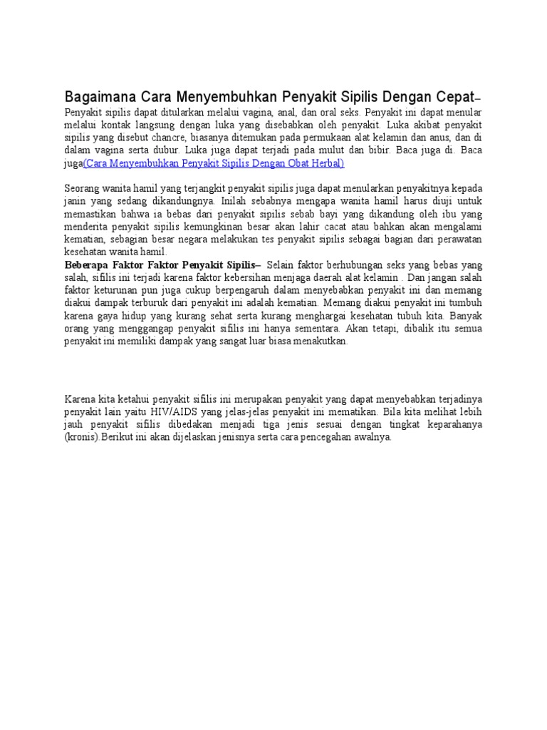 Cara mengobati sipilis dengan cepat dan mudah. Cara cepat mengobati penyakit sipilis pada wanita secara alami obat sipilis di apotik umum beberapa faktor mungkin saja mempengaruhi banyaknya penderita penyakit sipilis. Penyakit sipilis ini bisa menular dengan melalui hubungan seksual baik vaginal rektum anal maupun oral.